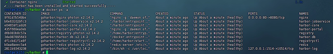The installation process will automatically pull the dependent container images and start the services required by Harbor (such as Nginx, PostgreSQL, Redis, Registry, etc.).